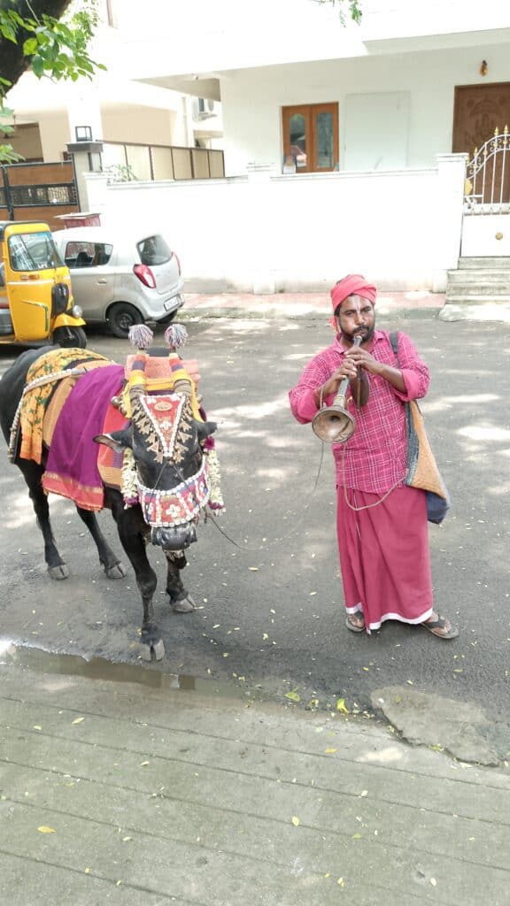 It’s around 10 in the morning, rush hour on a weekday in this 21st century digital era. The metropolis is wide awake, people are taking their fast cars, bikes or trains or packed buses to give the last day of the week their best shot. Suddenly live notes of the nagaswaram reach my ears from the road two storeys below. I shout to the apartment’s watchman to call the keeper of the ‘boom-boom’ maadu (bull) as I scramble around for some money. Marimuthu is waiting at the gate holding a nagaswaram and a rope at the other end of which is the bull or ‘Nandi’ — the vehicle of Shiva! Conversing with him, I learned that the bull is believed to efface the malefic influence of planets on dwellings and their denizens. Marimuthu, who as a devotee of Vishnu sports a white and red namam on his forehead, is a harbinger of hope. When Marimuthu speaks to his bull, which has a prominent hump, it shakes its head this way and that making the bells it is decked with jingle. Its called boom-boom maadu because the bull understands and shakes its head when spoken to. In Telugu-accented Tamil, Marimuthu tells me he is from Tirunirai (near Minjur) which it seems is generic for a sacred town. While in my part of the city, he camps at Gangaiamman temple in Aynavaram. He took up this way of life even as a boy following the example of his grandfather and father. His son is however getting a formal education. Marimuthu and Perumal are at once an anachronism and an enduring cultural symbol. I cannot imagine what it would be like to be in his place carrying the weight of the world on his shoulders. ‘How long will the two hold up against faceless modernisation is the question?’