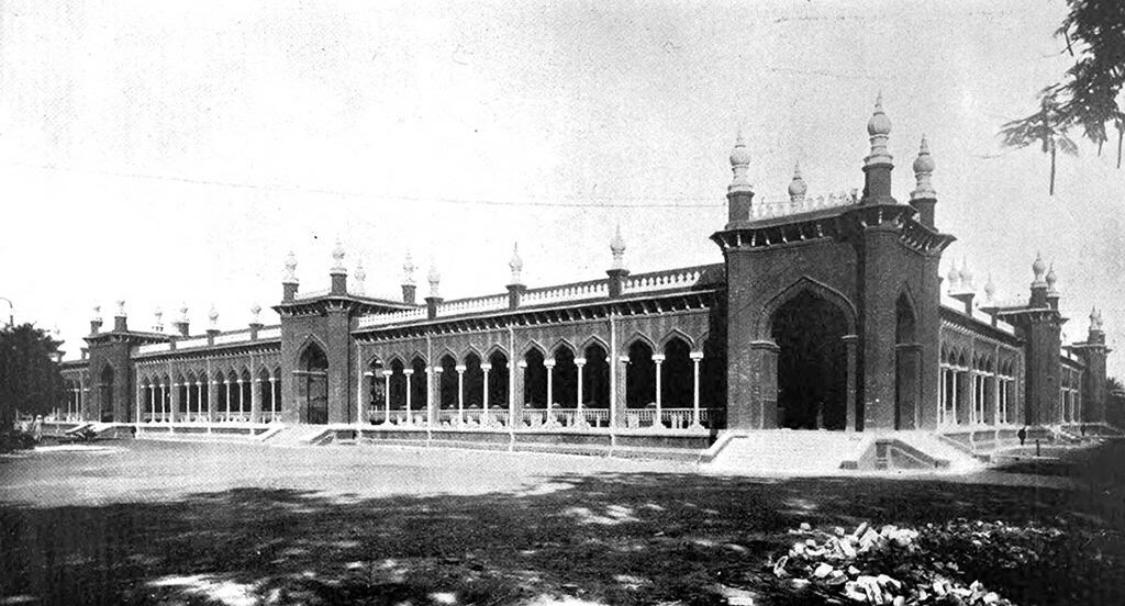 Passing along the road by the General Hospital Bridge spanning Cochrane’s Canal, we come to a line of imposing buildings fringing the southern edge of the People’s Park. The first of these is the Moore Market named after Sir George Moore, a former popular President of the Corporation who took great interest in its foundation in the place of the congested and insanitary market that existed in Broadway which has since been converted into a park. The structure is a quadrangular in shape with an open space in the centre laid out as a garden and with arcades all around. The market is a convenience to the middle and upper classes of the population and is well ventilated and kept in a clean condition. To the east and north of the market are the supplementary structures called the hawker’s stalls, allotted to the vendors of worn-out and second-hand goods, who formerly vended their wares in what was known as Guzili Bazaar near the Memorial Hall.