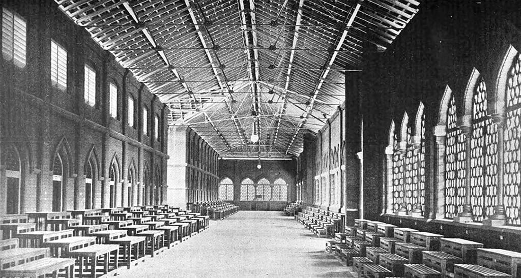“The verandahs have wrought-iron railings on their outer sides. The gates, railings and trusses of the roof of the hall were manufactured at the local municipal workshop, while the cast-iron columns were obtained from England. The halls, four in number, corresponding to the four sides are each 30 ft wide, two are each 220 ft and two each 140 ft long. The roof is pent, and covered with Mangalore pattern tiles, manufactured by Arbuthnot and Co of Madras. The floors are of Cudappah stone (slate) in 6-in. concrete, and laid sloping from the centre to the sides, where there are U-shaped drains for carrying off all the washings.”