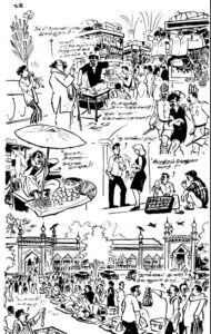 The following is a passage from Thillana Mohanambal, the novel by ‘Kalaimani’ (Kothamangalam Subbu) and set in the South India of the 1920s, though it was written much later. This particular scene does not appear in the film based on the novel. Dharuman, the drone accompanist for nagaswaram maestro Shanmugasundaram, and Muthurakku, the tavil player, have come to Madras. They are attending on Shanmugasundaram who is undergoing treatment at the General Hospital. One day they decide to visit Moore Market and not knowing it is just opposite are charged exorbitantly for the ride by a wily rickshawpuller. They then alight outside the market and begin their exploration.
