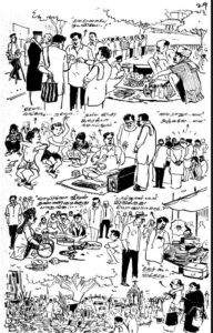 “Whatever you take, 75 paisa!” — thus screams a vendor as he pushes a cart laden with several articles. A crowd immediately surrounds him. Some distance away a woman is selling food. Around her are poor people, flies and dogs. What she is selling are the leftovers from the tiffin carriers that are delivered to the workers at various factories. These are combined into one dish and that is being sold!
