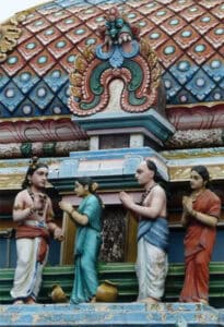 Sambandar resurrecting Poompavai, as seen in a frieze atop the Kapali temple gopuram.