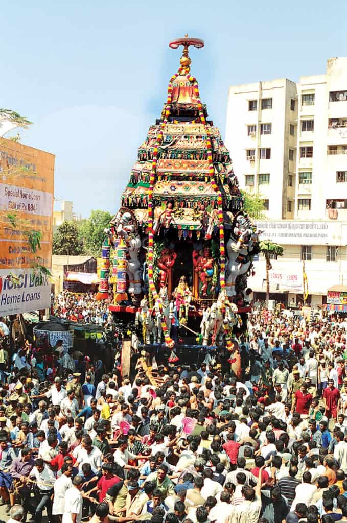 A tradition that has been kept alive since the days when Mylapore was just a village, the Brahmotsavam starts with an offering to the guardian deity Kolavizhi Amman at her shrine, a short distance away. The ten-day festival draws huge crowds, with numbers surging on certain days such as the Adhikara Nandi on the third morning, the Rishabha Vahanam on the fifth night and the Ther procession on the seventh morning of the festival. However, the pinnacle of them all is the Arupathumoovar festival on the eighth afternoon, when Lord Shiva comes out in a grand procession, granting darshan to the 63 Nayanmars – the saints of the Shaivite canon. This piece is a description of the festival published in 1910 in Viveka Bodhini, the magazine that was being brought out by V. Kuppuswamy Iyer, the founder of the Alliance Company.